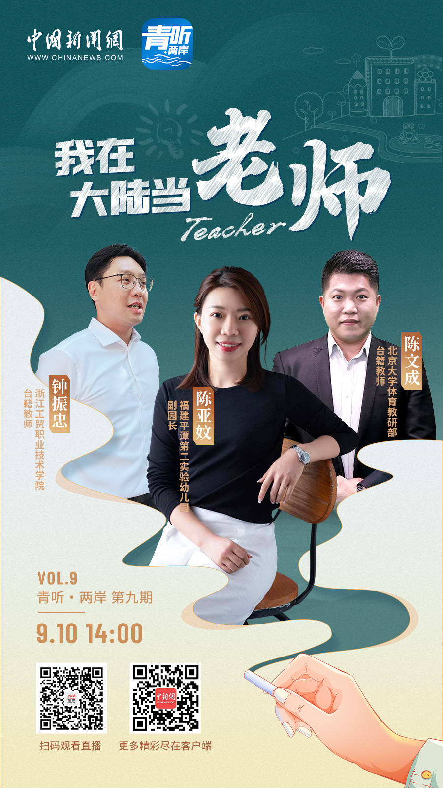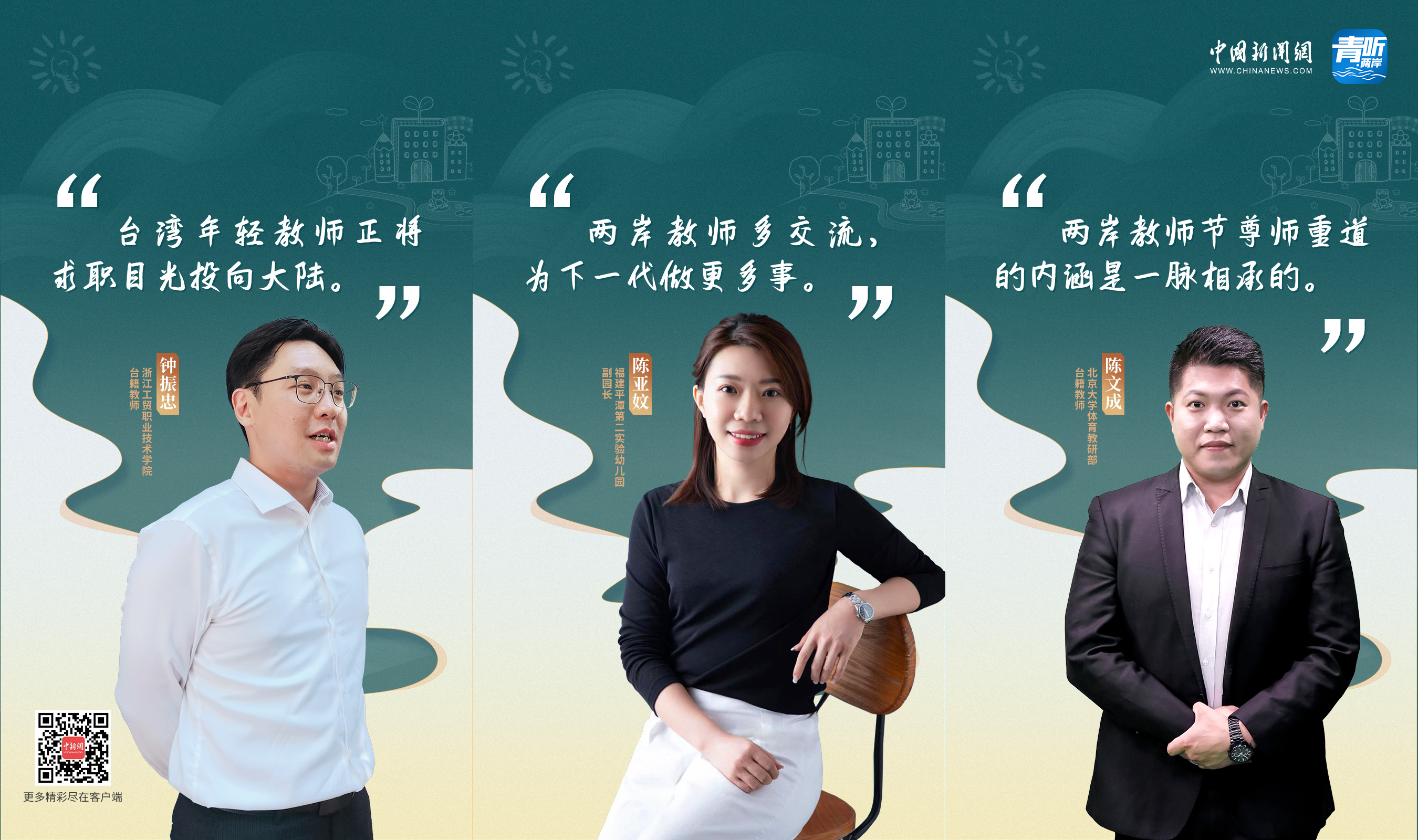教師節(jié)這天,北京大學(xué)體育教研部教師陳文成、浙江工貿(mào)職業(yè)技術(shù)學(xué)院教師鐘振忠、福建平潭第二實驗幼兒園副園長陳亞妏,三位臺籍教師做客中國新聞網(wǎng)《青聽·兩岸》欄目,分享了他們“登陸”做老師的故事。