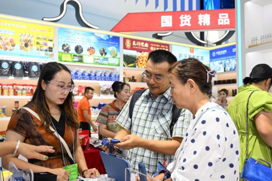 9月6日,游客(中)在第四屆中國—蒙古國博覽會(huì)上選購商品。新華社記者 貝赫 攝