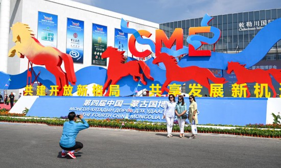 9月6日,游客在第四屆中國—蒙古國博覽會(huì)舉辦地——內(nèi)蒙古呼和浩特市敕勒川國際會(huì)展中心外合影。新華社記者 貝赫 攝