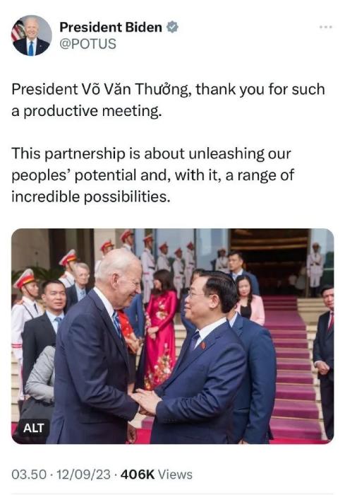 在這條發(fā)布在美國總統(tǒng)官方賬號(hào)上的帖子里,拜登為“富有成效的會(huì)議”向武文賞(Vo Van Thuong)表示感謝。然而,配發(fā)的圖片中并沒有出現(xiàn)武文賞,而是放了拜登和越南國會(huì)主席王庭惠(Vuong Dinh Hue)握手的照片。這條帖子目前已被刪除。