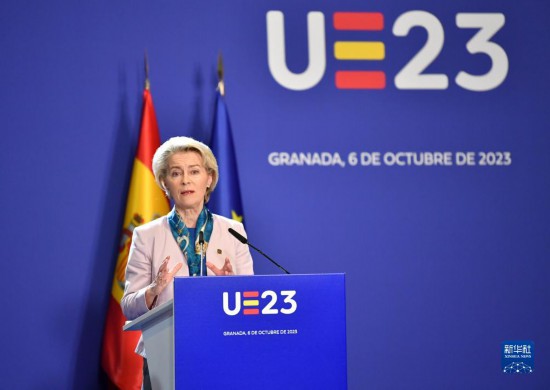 10月6日,在西班牙南部城市格拉納達(dá),歐盟委員會(huì)主席馮德萊恩在歐盟領(lǐng)導(dǎo)人非正式會(huì)議后舉行的新聞發(fā)布會(huì)上講話。新華社記者連漪攝