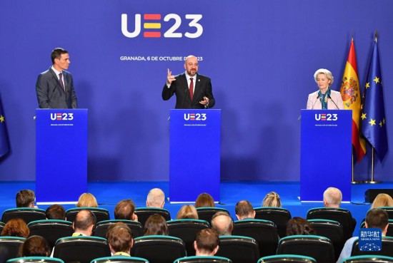 10月6日,在西班牙南部城市格拉納達(dá),西班牙代理首相桑切斯(后左)、歐洲理事會(huì)主席米歇爾(后中)、歐盟委員會(huì)主席馮德萊恩(后右)在歐盟領(lǐng)導(dǎo)人非正式會(huì)議后出席新聞發(fā)布會(huì)。新華社記者連漪攝