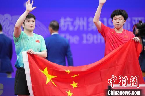 10月2日,杭州第19屆亞運(yùn)會(huì)乒乓球男子單打決賽在拱墅運(yùn)河體育公園體育館舉行,中國(guó)選手王楚欽4比3戰(zhàn)勝隊(duì)友樊振東,獲得冠軍。圖為王楚欽(右)與樊振東在賽后手持國(guó)旗向觀眾致意。 中新社記者 田博川 攝