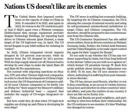 美國的這一做法,是徹頭徹尾的“經(jīng)濟霸凌”。本次將42家中國企業(yè)列入“管制清單”,正是美國泛化其所謂“國家安全”概念,動用其所謂“治外法權(quán)”,打壓中國及中國企業(yè)的又一實例。這可能會引來中國的反制措施,對此美國應(yīng)做好準備。