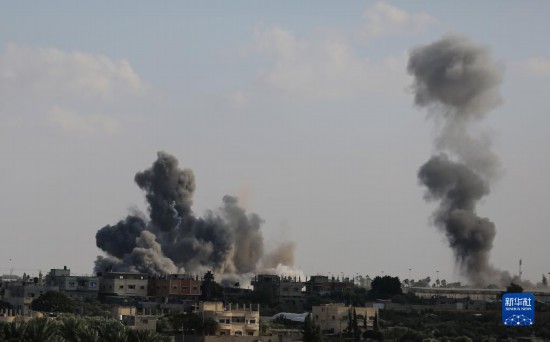 10月10日,在加沙地帶南部城市拉法,以色列空襲后升起濃煙。新華社發(fā)(哈立德·奧馬爾攝)