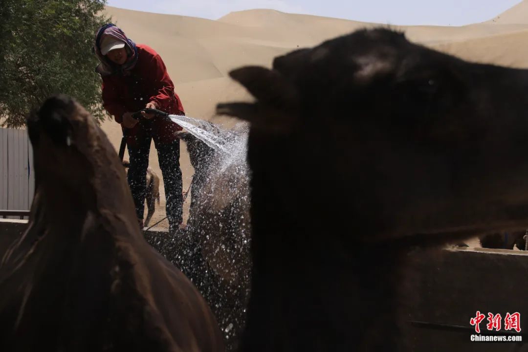 牽駝人為駱駝洗澡沖涼。敦煌市委宣傳部供圖