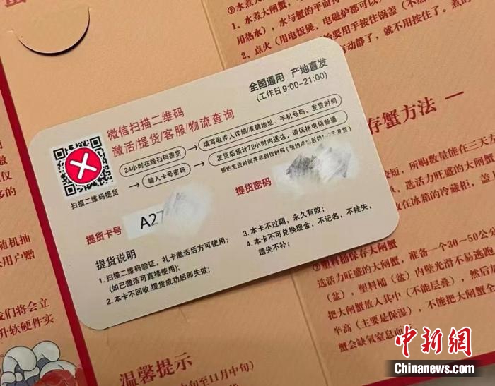 通常來說,消費者收到正規(guī)蟹卡后,可通過卡號和密碼,自行選擇相關的平臺進行兌換。但瀟瀟收到的“蟹卡”,要求“掃描二維碼驗證,禮卡激活后方可使用”。