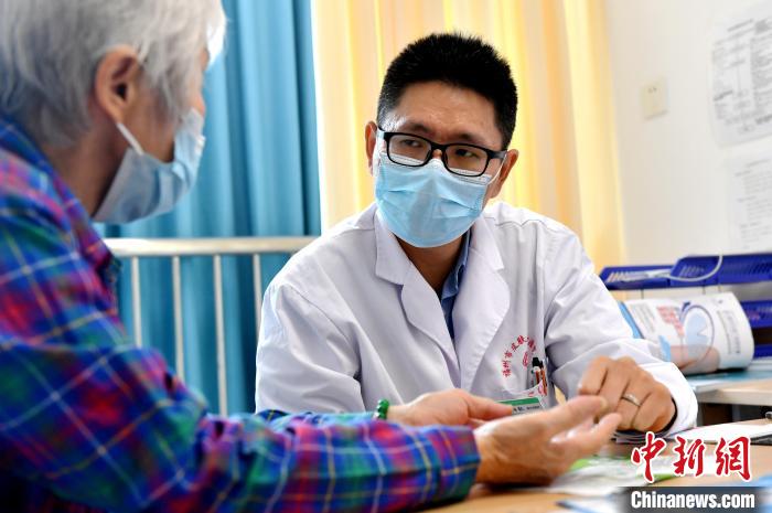 10月9日,現(xiàn)就職于福州市皮膚病防治院的臺(tái)籍醫(yī)生陳柏叡在與一名患者交流。 中新社記者 呂明 攝