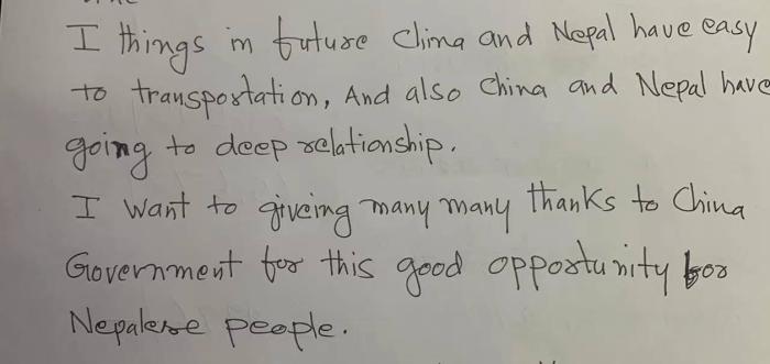 國之交在于民相親,民相親在于心相通。采訪過后,這位老人認認真真地用英文寫下一封信并交給中新網(wǎng)記者。他說:“我相信,未來中尼交通將更加便利,兩國情誼將更加深厚。我非常、非常地感謝中國政府,為尼泊爾人民帶來了這些大好機會?!?/p>