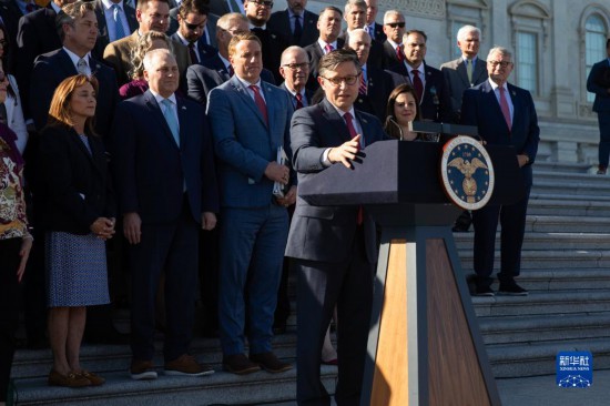 10月25日,在美國華盛頓國會(huì),新當(dāng)選的眾議院議長邁克·約翰遜發(fā)表講話。新華社發(fā)(亞倫攝)