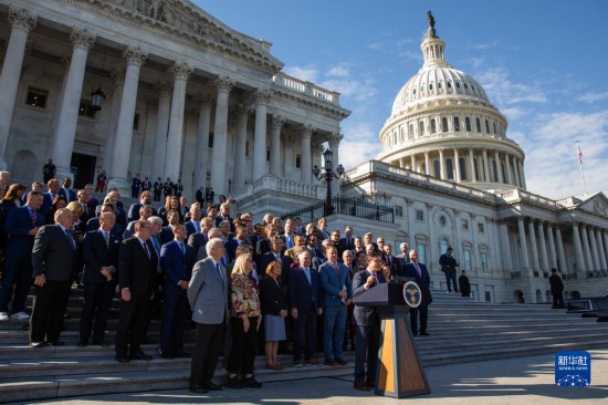 10月25日,在美國華盛頓國會(huì)外,新當(dāng)選的眾議院議長邁克·約翰遜(前)發(fā)表講話。新華社發(fā)(亞倫攝)