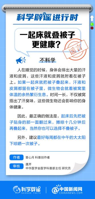 中新網(wǎng)11月17日電 人在睡覺的時(shí)候,身體會(huì)排出大量的汗液和皮屑,這些汗液和皮屑就附著在被子上。如果一起床就把被子疊起來,汗液和皮屑都留在被子里,微生物會(huì)就著被窩里體溫的余熱繁衍生息。時(shí)間一長(zhǎng),不僅被窩捂出了汗臭味,這些微生物還會(huì)影響你的身體健康。(來源:@科學(xué)辟謠 @中國新聞網(wǎng) )
