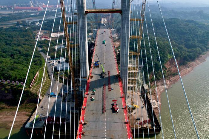 斜拉和懸索組合,強強聯(lián)合,牢固度加倍。大橋采用的這種構建形態(tài),有效減少了江中橋墩對航運的影響。中鐵大橋局項目部黨工委副書記張馳對中新網(wǎng)記者介紹,這種設計的優(yōu)點是跨度大、剛性強、成本低,未來將被廣泛采納和使用。