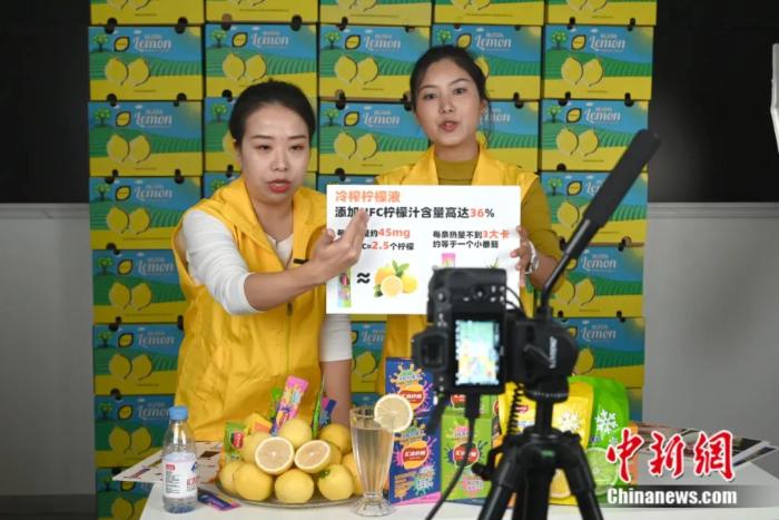 圖片圖為工作人員通過(guò)直播銷(xiāo)售檸檬。張旭 攝