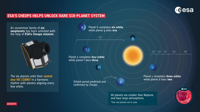 美國國家航空航天局(NASA)的“凌日系外行星巡天衛(wèi)星”(TESS)在2020年和2022年觀測 HD110067,發(fā)現(xiàn)該恒星亮度的數次下降,加之來自“系外行星特性探測衛(wèi)星”(CHEOPS)的更多觀測,論文第一作者和通訊作者、美國芝加哥大學R. Luque與同事及合作者研究認為,這些跡象可解釋為6顆行星從恒星前面經過。通過研究3顆最深處行星,他們計算了所有6顆行星的軌道,從最深處的約9天,到最外層的約54天。