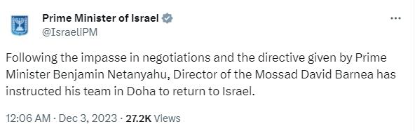 聲明稱,“談判陷入僵局后,經(jīng)(以色列)總理內(nèi)塔尼亞胡指示,(以色列情報機構(gòu))摩薩德負責(zé)人大衛(wèi)·巴尼亞命令其在多哈的團隊返回以色列?!?/p>