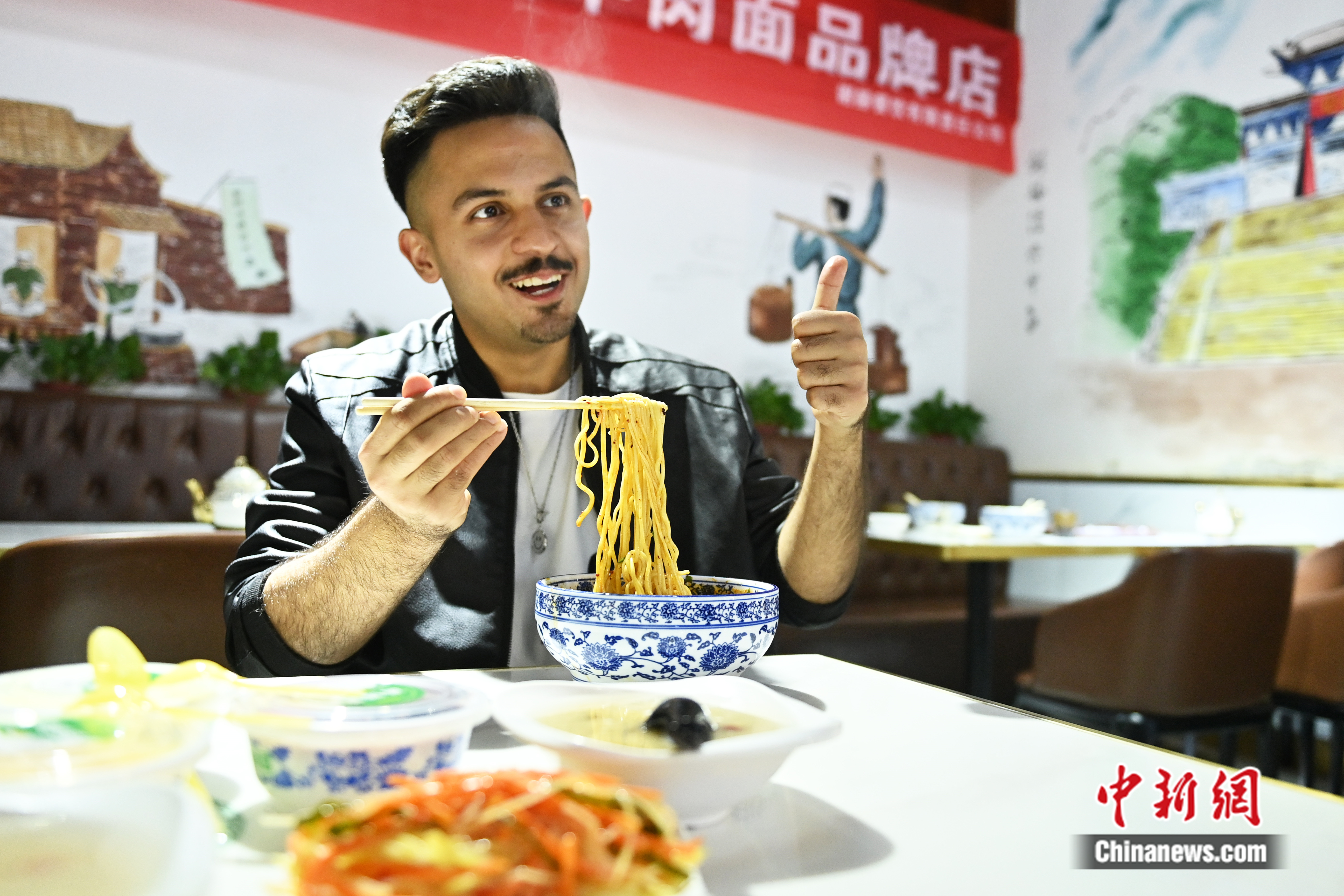 蘭州理工大學(xué)留學(xué)生潘迪在面館點贊蘭州美食。中新網(wǎng)記者 李亞龍 攝