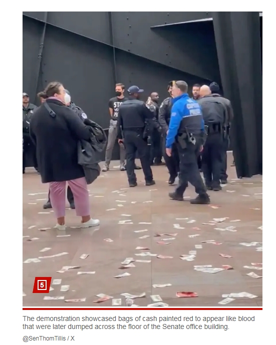 據(jù)美國(guó)《紐約郵報(bào)》報(bào)道,在抗議示威活動(dòng)中,有成袋的美元鈔票被涂上紅色,看上去“血跡斑斑”,并被傾倒在大廳的地板上。