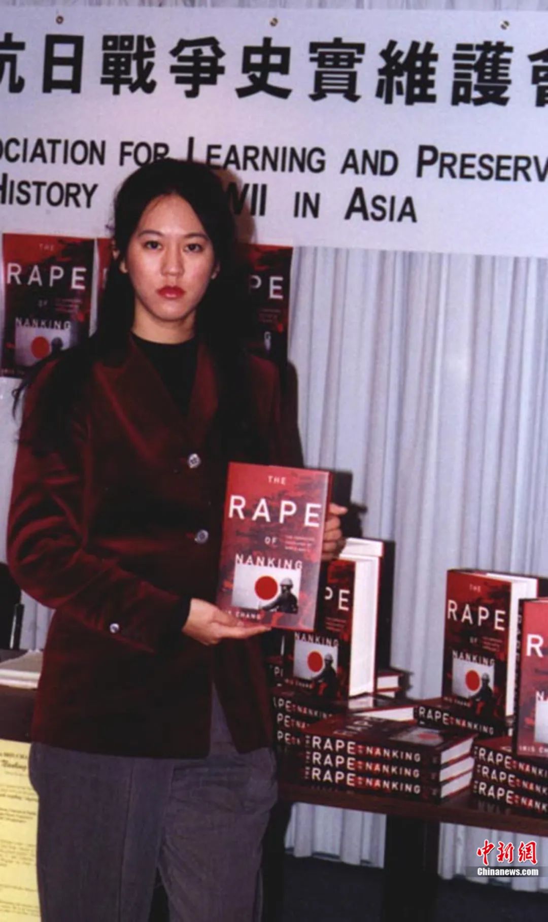 美國(guó)華裔作家張純?nèi)缗c她的著作《南京暴行——被遺忘的大屠殺》。鐘欣 攝