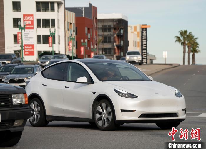 當(dāng)?shù)貢r(shí)間12月13日,特斯拉電動(dòng)汽車駛過(guò)美國(guó)加州圣馬特奧縣一處路口?!≈行律缬浾?劉關(guān)關(guān) 攝
