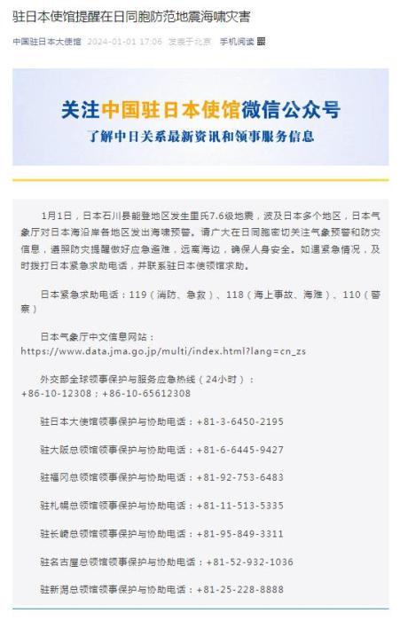 中新網(wǎng)1月1日電 據(jù)中國(guó)駐日本大使館官方公眾號(hào)消息,1月1日,日本石川縣能登地區(qū)發(fā)生里氏7.6級(jí)地震,波及日本多個(gè)地區(qū),日本氣象廳對(duì)日本海沿岸各地區(qū)發(fā)出海嘯預(yù)警。請(qǐng)廣大在日同胞密切關(guān)注氣象預(yù)警和防災(zāi)信息,遵照防災(zāi)提醒做好應(yīng)急避難,遠(yuǎn)離海邊,確保人身安全。如遇緊急情況,及時(shí)撥打日本緊急求助電話,并聯(lián)系駐日本使領(lǐng)館求助。