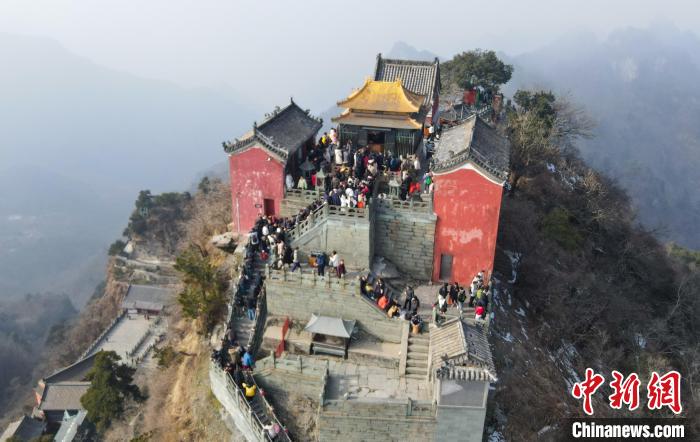 1月1日,武當(dāng)山金頂上前來祈福的游客絡(luò)繹不絕。(無人機照片)張倩龍 攝