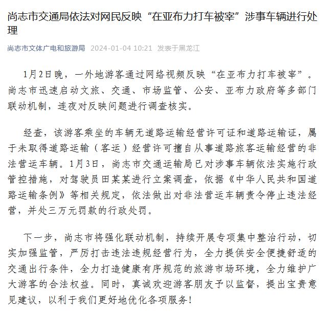 經(jīng)查,該游客乘坐的車輛無道路運(yùn)輸經(jīng)營許可證和道路運(yùn)輸證,屬于未取得道路運(yùn)輸(客運(yùn))經(jīng)營許可擅自從事道路旅客運(yùn)輸經(jīng)營的非法營運(yùn)車輛。1月3日,尚志市交通運(yùn)輸局已對涉事車輛依法實(shí)施行政管控措施,對駕駛員田某某進(jìn)行立案調(diào)查,依據(jù)《中華人民共和國道路運(yùn)輸條例》等相關(guān)規(guī)定,依法做出對非法營運(yùn)車輛責(zé)令停止違法經(jīng)營,并處三萬元罰款的行政處罰。