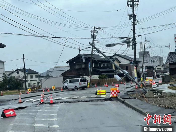 圖為1月3日石川縣輪島市周邊,地震導(dǎo)致道路損壞,電線桿歪倒。 中新社發(fā) 劉勇 攝