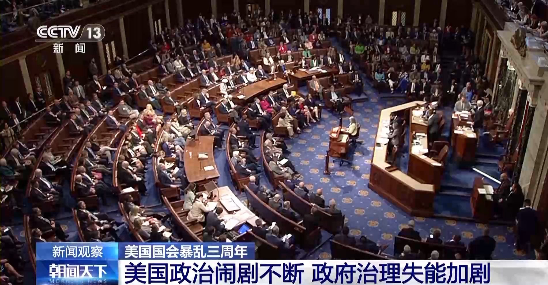 如今,美國國會(huì)暴亂事件已經(jīng)過去三年,國會(huì)大廈這一“美國政治的象征”成了美國民主、共和兩黨相互攻訐、上演一出出政治鬧劇的舞臺(tái)。在美國政治極化、黨爭(zhēng)加劇的環(huán)境下,美國經(jīng)濟(jì)社會(huì)議程遲滯,政府治理失能現(xiàn)象惡化,美國社會(huì)沉疴難愈。