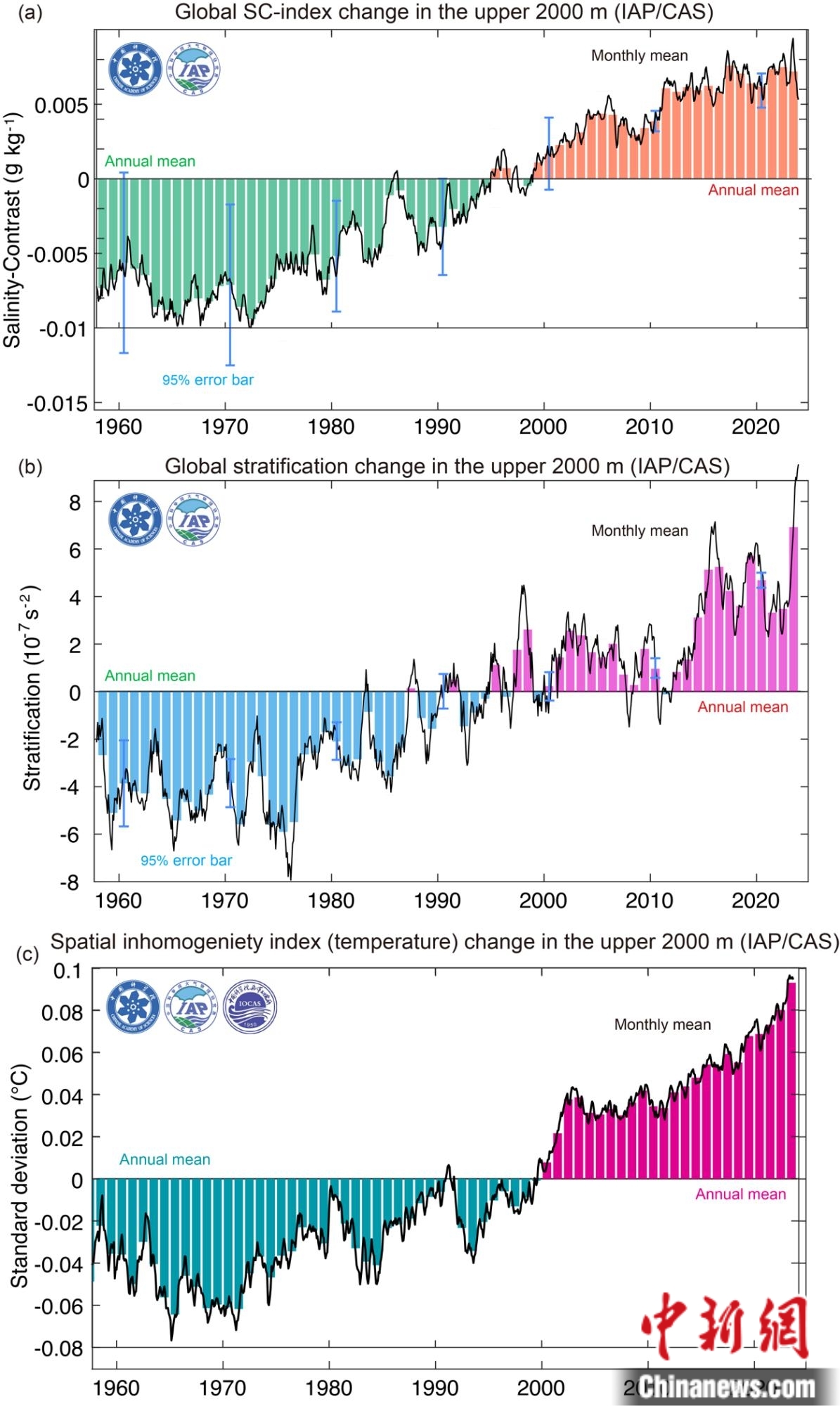 1958-2023年全球海洋上層2000米鹽度差指數(shù)SC(a)、層結(jié)(b)、溫度空間非均勻性指數(shù)(c)變化時間序列。黑色線條為月度變化,條狀色條為年變化。中國科學院大氣物理研究所/供圖