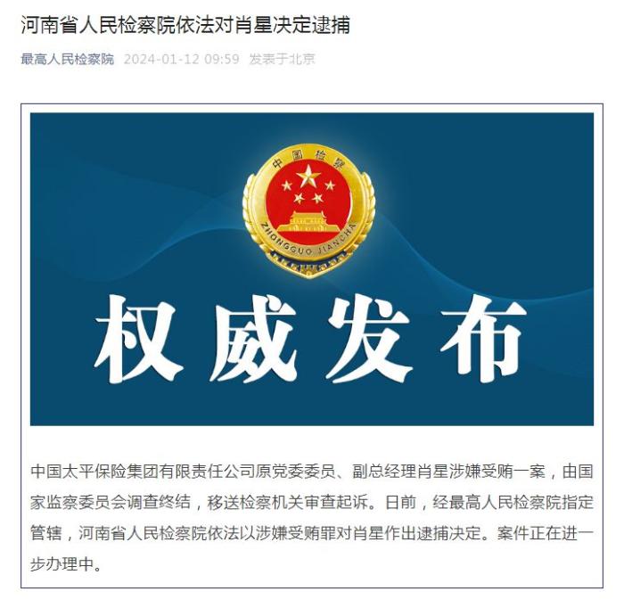 中新網(wǎng)1月12日電 據(jù)最高人民檢察院微信公眾號消息,中國太平保險(xiǎn)集團(tuán)有限責(zé)任公司原黨委委員、副總經(jīng)理肖星涉嫌受賄一案,由國家監(jiān)察委員會調(diào)查終結(jié),移送檢察機(jī)關(guān)審查起訴。日前,經(jīng)最高人民檢察院指定管轄,河南省人民檢察院依法以涉嫌受賄罪對肖星作出逮捕決定。案件正在進(jìn)一步辦理中。