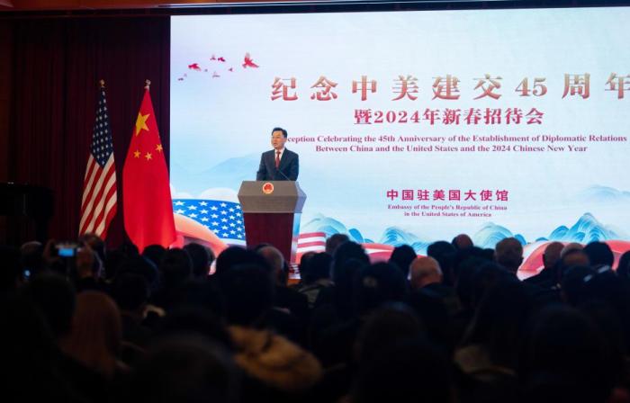 當(dāng)?shù)貢r(shí)間1月16日晚,中國駐美國使館隆重舉辦紀(jì)念中美建交45周年暨新春招待會。謝鋒大使出席并發(fā)表致辭。