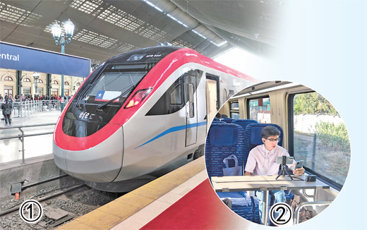 圖①:中企研制的電力內燃雙動力動車組列車??吭谥抢サ貋喐缰醒胲囌?。