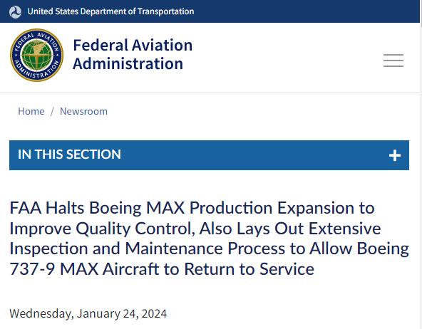 中新網(wǎng)1月25日電 當(dāng)?shù)貢r間1月24日,美國交通部發(fā)布公告稱,美國聯(lián)邦航空管理局(FAA)批準(zhǔn)了必須對每架停飛的波音737 MAX9型飛機(jī)執(zhí)行徹底的檢查和維護(hù)程序,檢查維護(hù)完成后這些飛機(jī)才有資格恢復(fù)運(yùn)營。