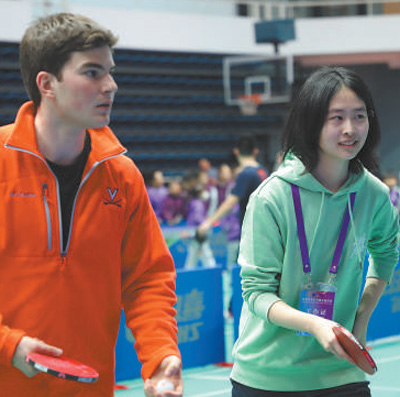 弗吉尼亞大學(xué)學(xué)生米莎與清華大學(xué)學(xué)生曾加寶組成搭檔。在練習(xí)環(huán)節(jié)中,對(duì)手朝著米莎的方向打來一記高難度弧圈球,米莎一時(shí)間有些不知所措,只聽曾加寶喊了一句“我來”,便眼疾手快地沖了過去,擋在米莎前面,接住了這個(gè)球。這有趣又溫馨的一幕,引來了現(xiàn)場(chǎng)觀眾的掌聲,也瞬間拉近了兩個(gè)年輕人的距離?!拔业拇顧n一直鼓勵(lì)我,耐心地指導(dǎo)我握拍、擊球。我們一起討論乒乓球和學(xué)業(yè),現(xiàn)在已經(jīng)成了朋友。”米莎說。