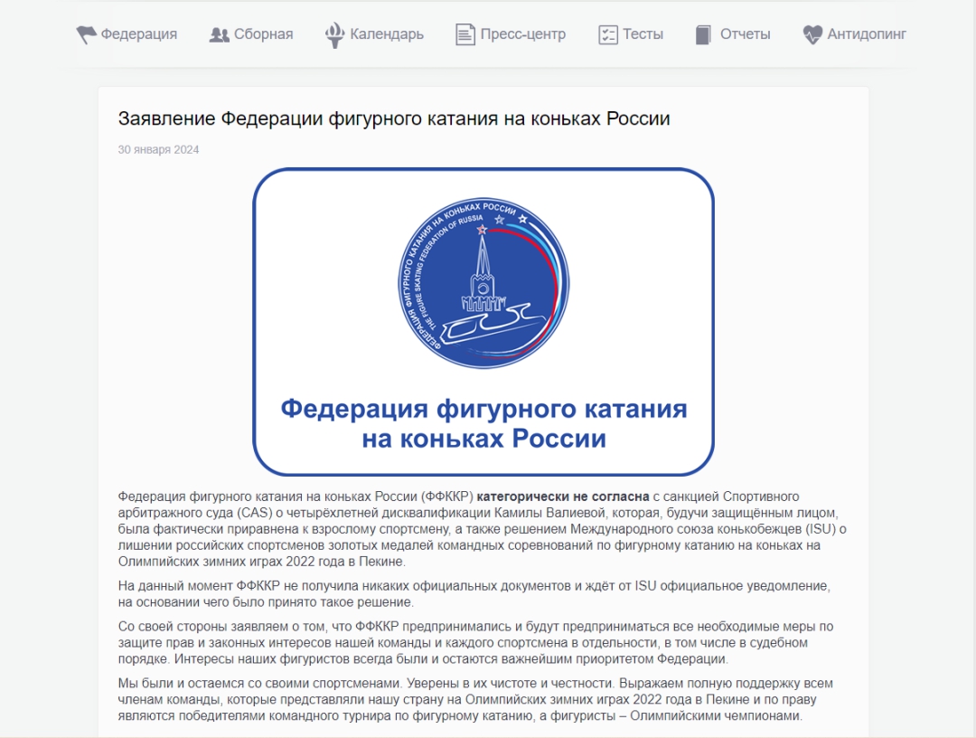 當(dāng)?shù)貢r間1月30日,俄羅斯花樣滑冰聯(lián)合會(FFKKR)發(fā)布聲明表示,團隊中運動員的誠信無可挑剔,“堅決不同意國際體育仲裁法庭對卡米拉·瓦利耶娃的處罰”。
