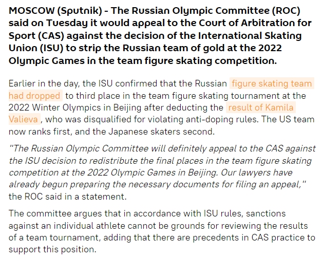 報道稱,俄羅斯奧委會認為對一位運動員的處罰不能成為審查團體比賽結(jié)果的理由,已開始準(zhǔn)備上訴所需文件。