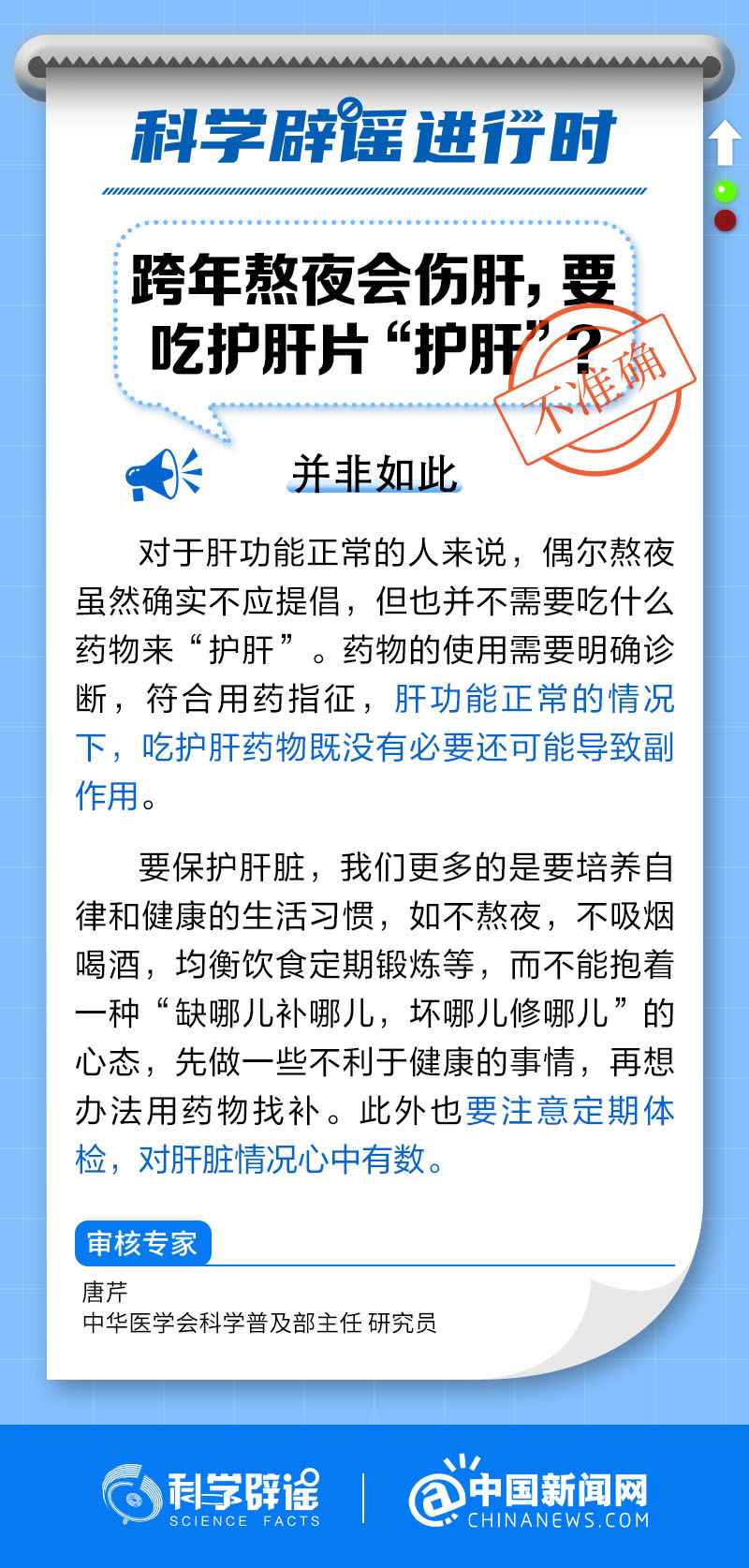 中新網(wǎng)1月30日電 對于肝功能正常的人來說,偶爾熬夜不需要吃什么藥物來“護(hù)肝”。藥物的使用需要明確診斷,符合用藥指征,肝功能正常的情況下,吃護(hù)肝藥物既沒有必要還可能導(dǎo)致副作用。要保護(hù)肝臟,我們更多的是要培養(yǎng)自律和健康的生活習(xí)慣,如不熬夜、不吸煙喝酒、均衡飲食、定期鍛煉等。(來源:@科學(xué)辟謠 中國新聞網(wǎng)微博 )