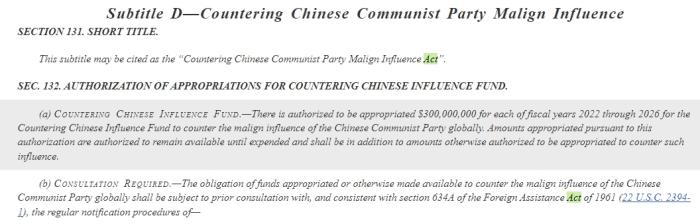 具體內(nèi)容為:“授權(quán)在2022年至2026年的每個(gè)財(cái)政年度,為‘對(duì)抗中國(guó)影響力基金’撥款3億美元,以對(duì)抗中國(guó)共產(chǎn)黨在全球的惡意影響。”