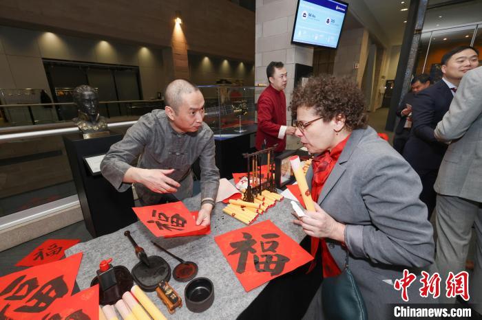 當(dāng)?shù)貢r間2月6日晚,加拿大蒙特利爾,中國駐蒙特利爾總領(lǐng)館與中國常駐國際民航組織理事會代表處在國際民航組織(ICAO)總部聯(lián)合舉辦“共慶春節(jié)”主題活動。圖為當(dāng)?shù)厝A人書法家(左)向與會嘉賓講解以中國書法書寫的“福”字?!≈行律缬浾? 余瑞冬 攝