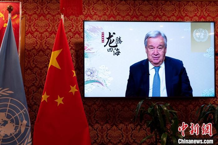 當(dāng)?shù)貢r間2月6日,聯(lián)合國秘書長古特雷斯通過視頻發(fā)表新春致辭,向中國人民和全球華人致以農(nóng)歷甲辰龍年的祝福和問候。圖為中國常駐聯(lián)合國代表團(tuán)紐約駐地的屏幕播放致辭。 中新社記者 王帆 攝