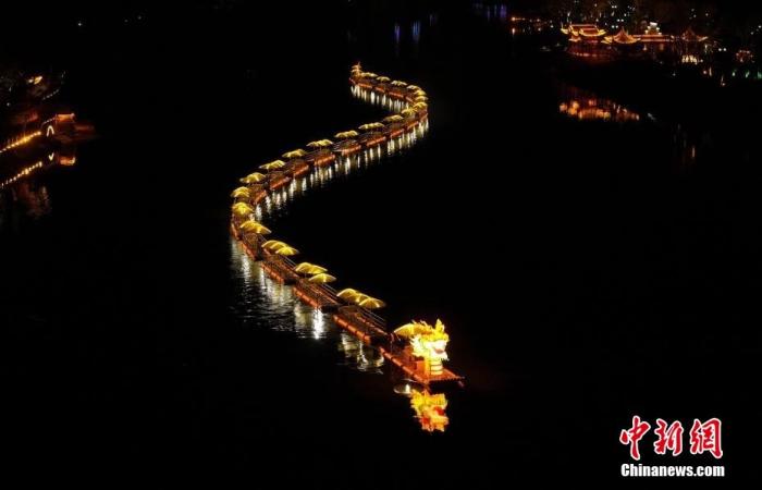 資料圖:一條200米長的水上金龍在安徽省黃山市休寧縣齊云山鎮(zhèn)橫江江面上游弋而過,龍燈迤邐,與江畔的古民居夜色相映成輝,喜迎新春。施亞磊 攝