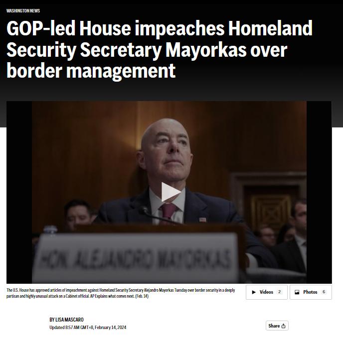 中新網(wǎng)2月14日電 綜合美媒報道,當?shù)貢r間13日,美國眾議院批準了針對邊境安全問題對國土安全部長馬約卡斯的彈劾條款,使他成為自1876年以來首位被眾議院彈劾的內(nèi)閣部長。
