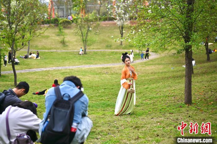 2月17日,廣西南寧青秀山風(fēng)景區(qū)內(nèi),游客身著漢服打卡拍攝。 俞靖 攝