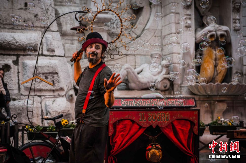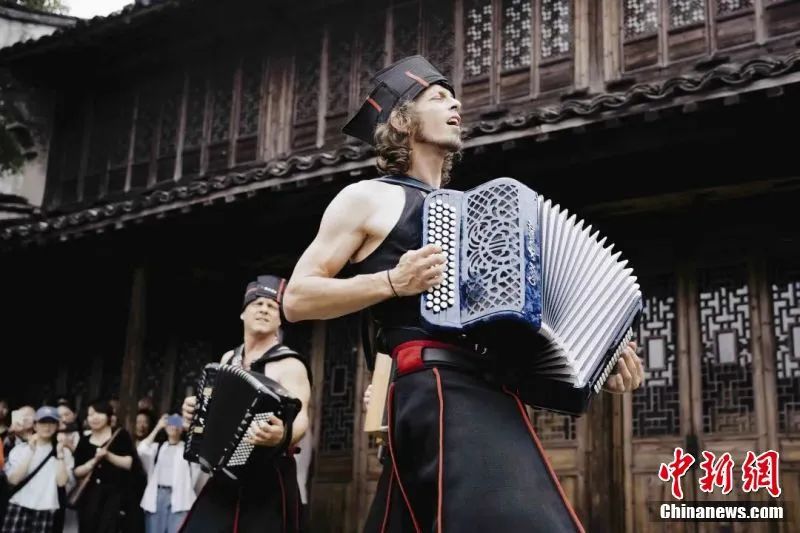 圖為國(guó)外藝術(shù)家在會(huì)昌戲劇小鎮(zhèn)中表演。圖源:會(huì)場(chǎng)戲劇小鎮(zhèn)公眾號(hào)