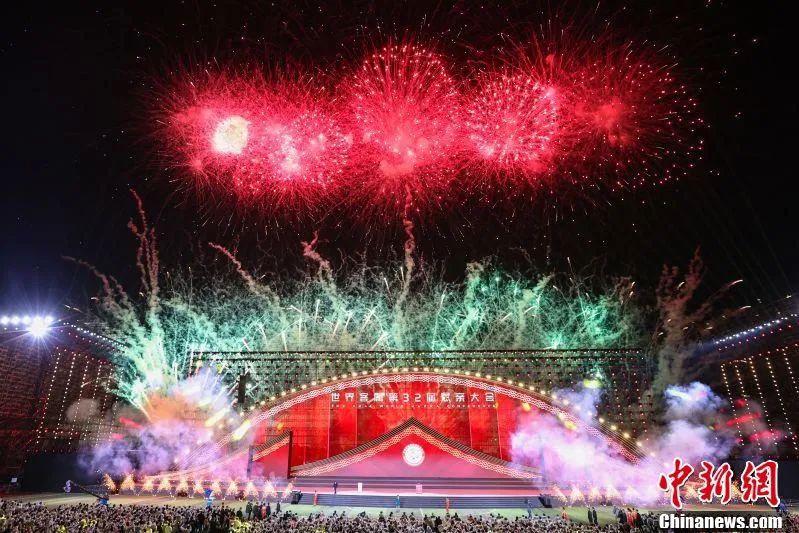 圖為世界客屬第32屆懇親大會(huì)開(kāi)幕式文藝晚會(huì)現(xiàn)場(chǎng)的焰火表演。劉力鑫 攝