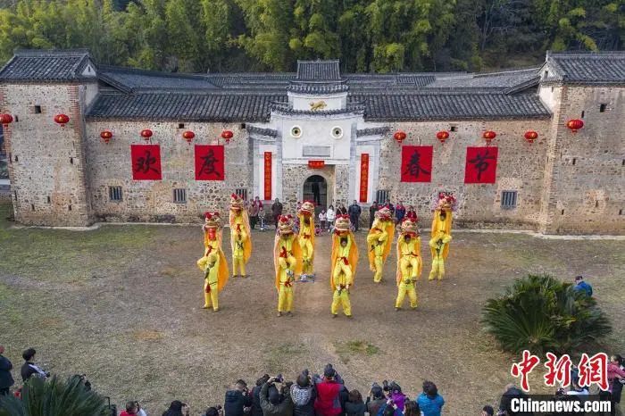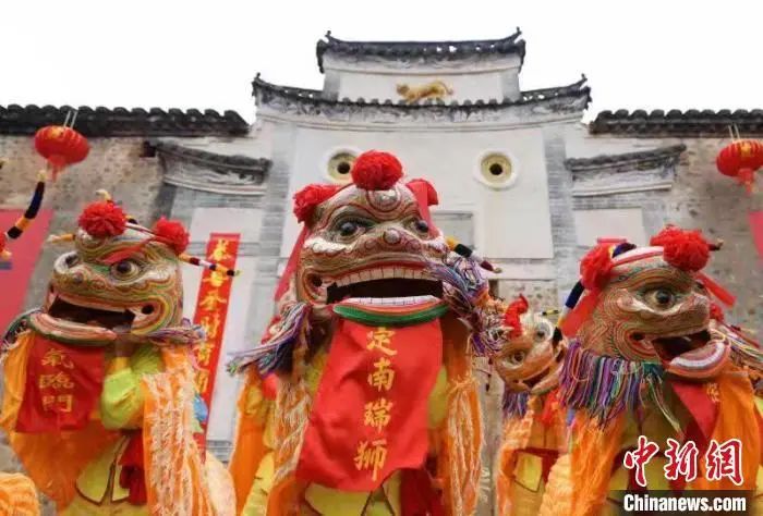 在江西省南部的定南縣“虎形圍”前,一場(chǎng)熱鬧的瑞獅民俗表演正慶祝著中國(guó)農(nóng)歷虎年新春。李穗 攝