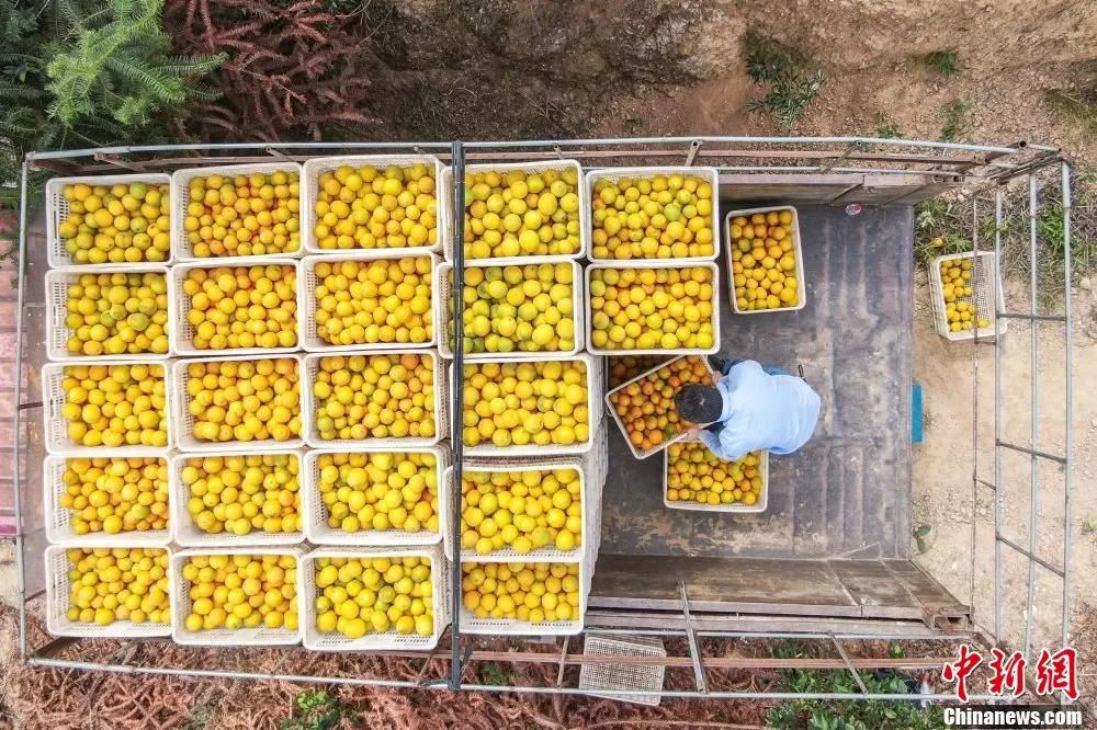 一箱箱金黃的臍橙裝車