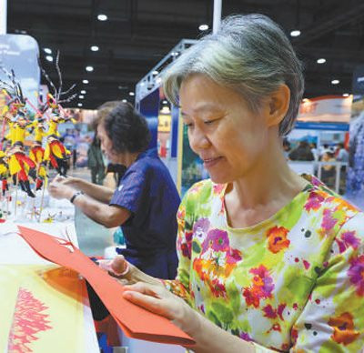 1月25日,在泰國(guó)國(guó)際旅游展上,參觀者體驗(yàn)中國(guó)剪紙。
