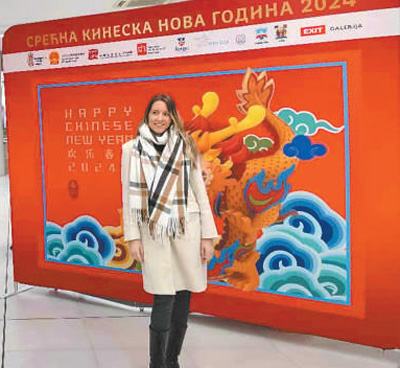 1月30日,在塞爾維亞諾維薩德,一位女士在“歡樂春節(jié)”活動(dòng)展板前留影。